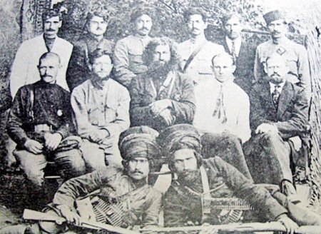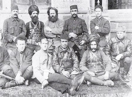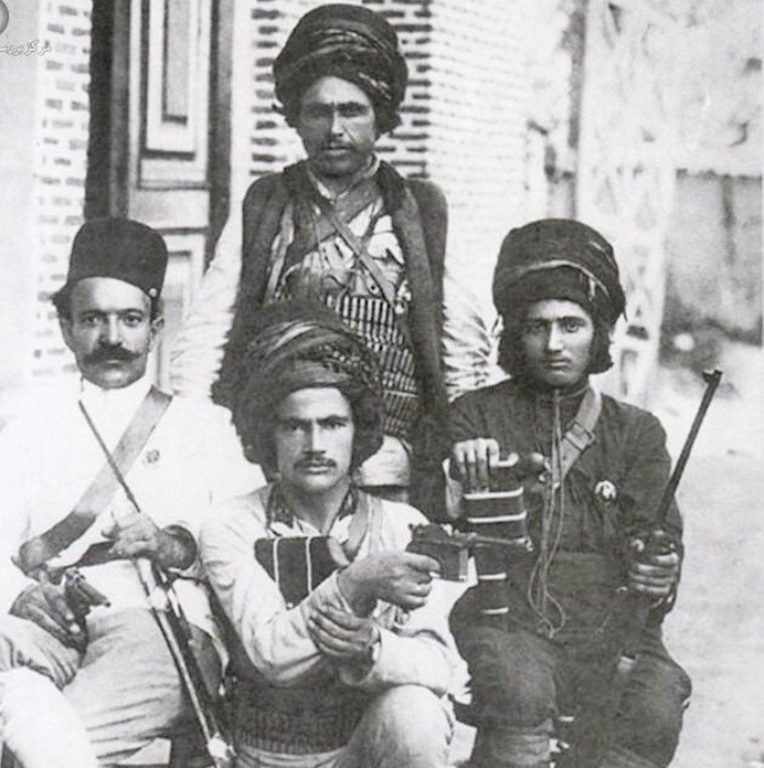گروه مشترک کارکنان ایرانی و روسی در رشت. ردیف بالا از چپ: سردار محیی، خالو قربان، احسانالله خان دوستدار، رضا خواجوی، الکساندر کووالیف. ردیف پایین: مراد موگویف، مشیر دیوان، کریم خان بزرگ و یکی از فرماندهان کُرد